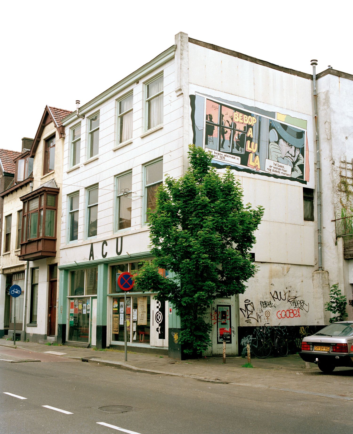 However, in the 90s, the ACU was a hot centre for queer (radical) activism, hosting special nights of information, films or parties. In the Springstof zine #16 (1981), there is a special piece on the five-year anniversary of the ACU squat. This shows the central place of the ACU in Utrecht’s squatting and queer life, as it was known as a “flikkercafé” (“gay men café”, but “flikker” refers specifically to the activist/left-wing type of gay man), but also hosted “kraakspreekuren” (“squatting consultation hours”, information meeting about squatting with advice on how to squat a building, legal advice, etc.).