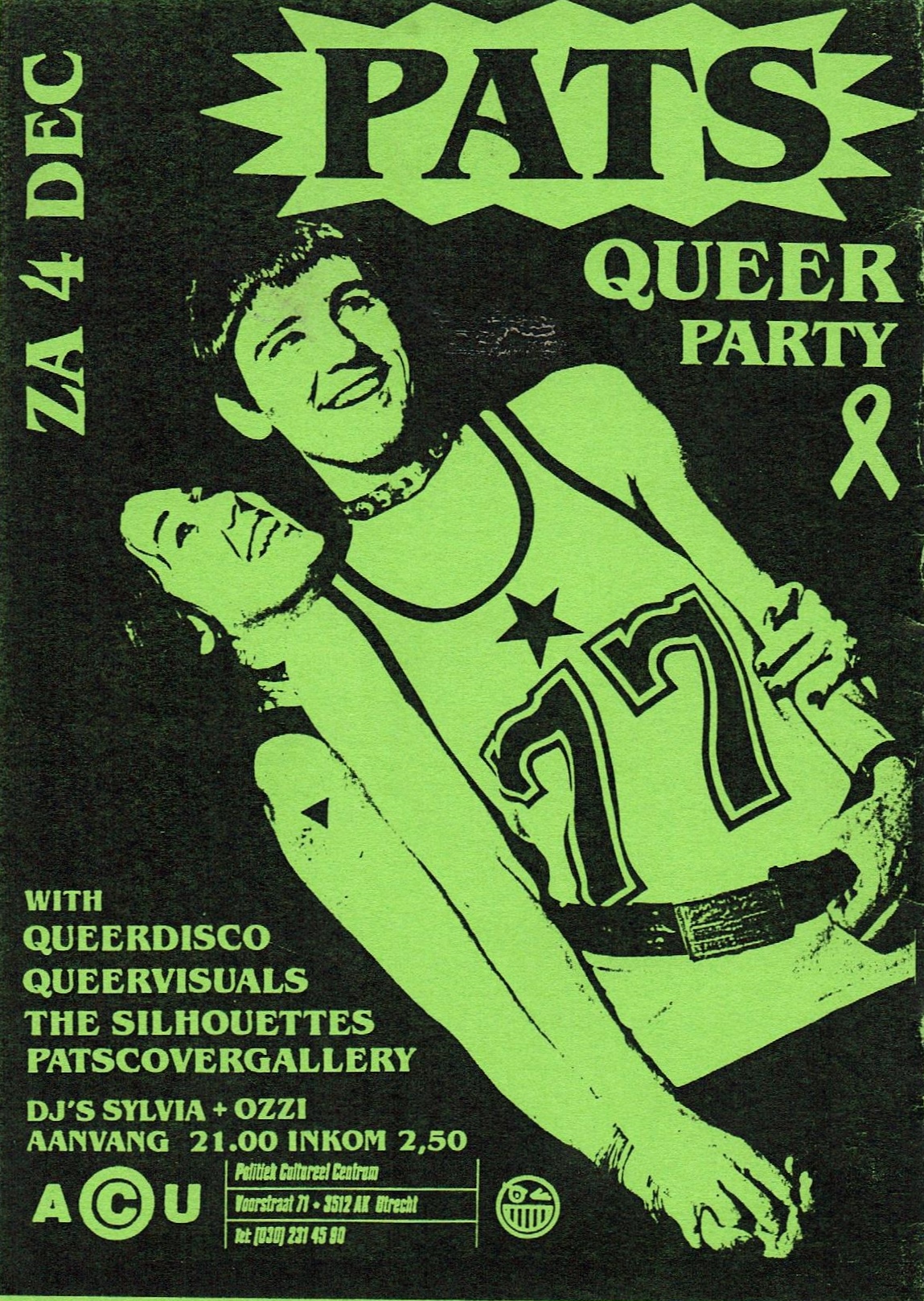From the 70s to the 90s, squatting was crucial for housing in the Netherlands. One of the most well-known former squats in Utrecht is the ACU on Voorstraat 71 in Utrecht, a vibrant place for radical left activism, and today for queer activism and culture as well. But queer people really started to hang out there from 1985, with the introduction of queer disco, on the initiative of PATS, a queer revolutionary fanzine from Utrecht. From the 1990s onwards, the ACU became a major place for queer (radical) activism in Utrecht. It was often the starting and ending point of demonstrations organised by the queer movement.